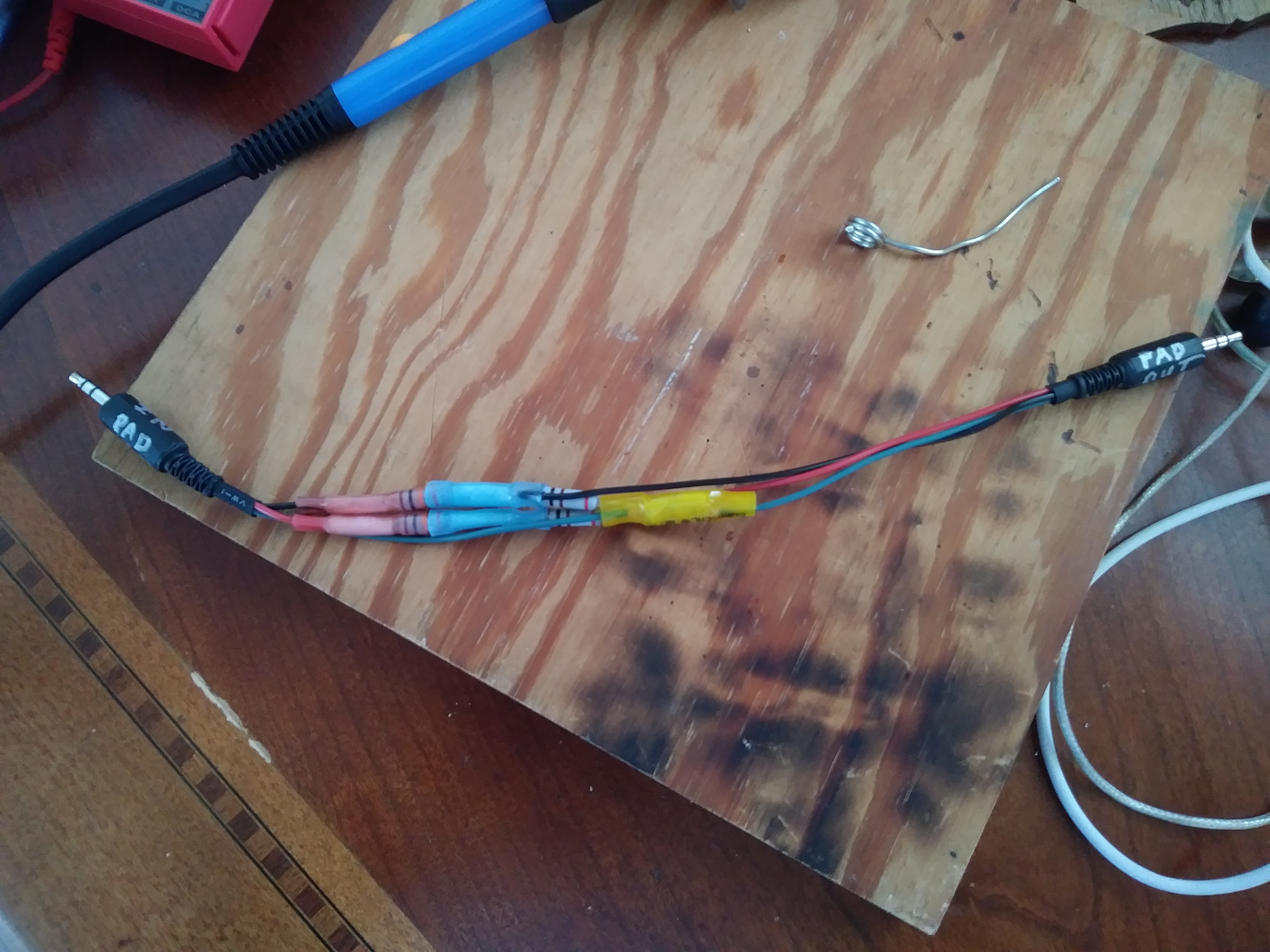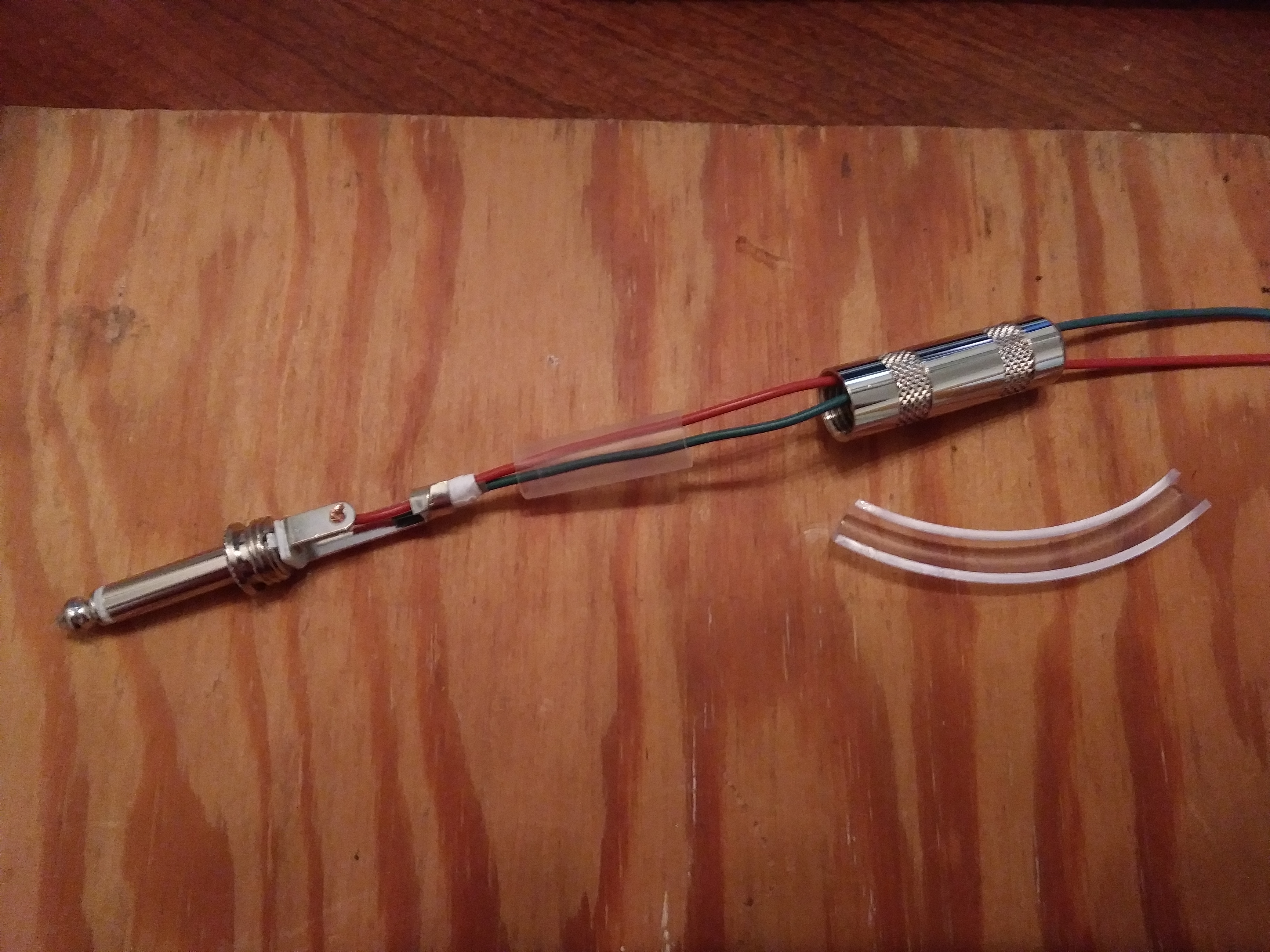 Using 20guage alarm wire since it's the most solid thing I have that will fit the 3.5mm connections, and it's nicely color coded. To add some stress relief for the 1/4inch connectors with the thin wire, I cut some PVC tubing in half and then folded it in like this: