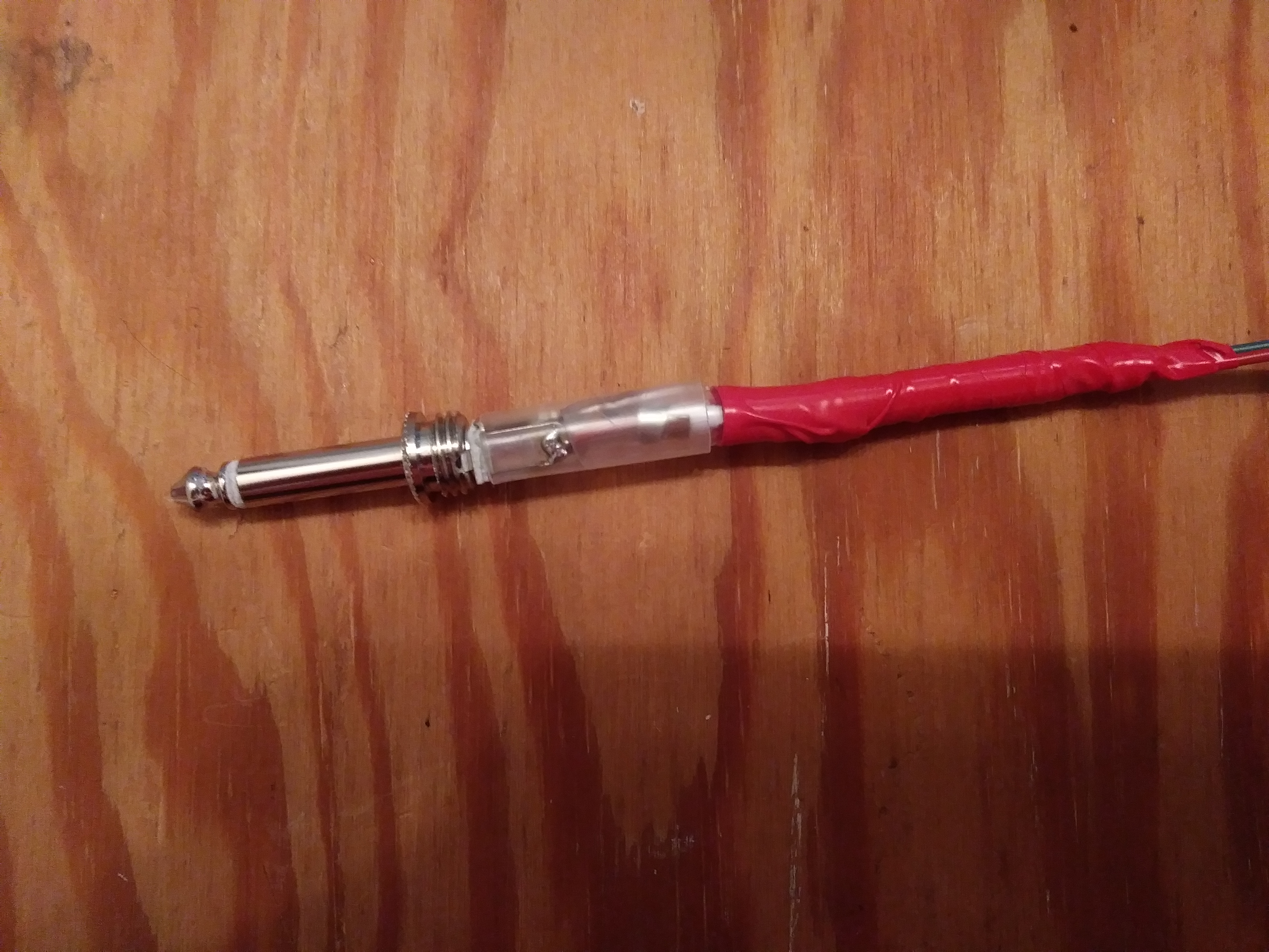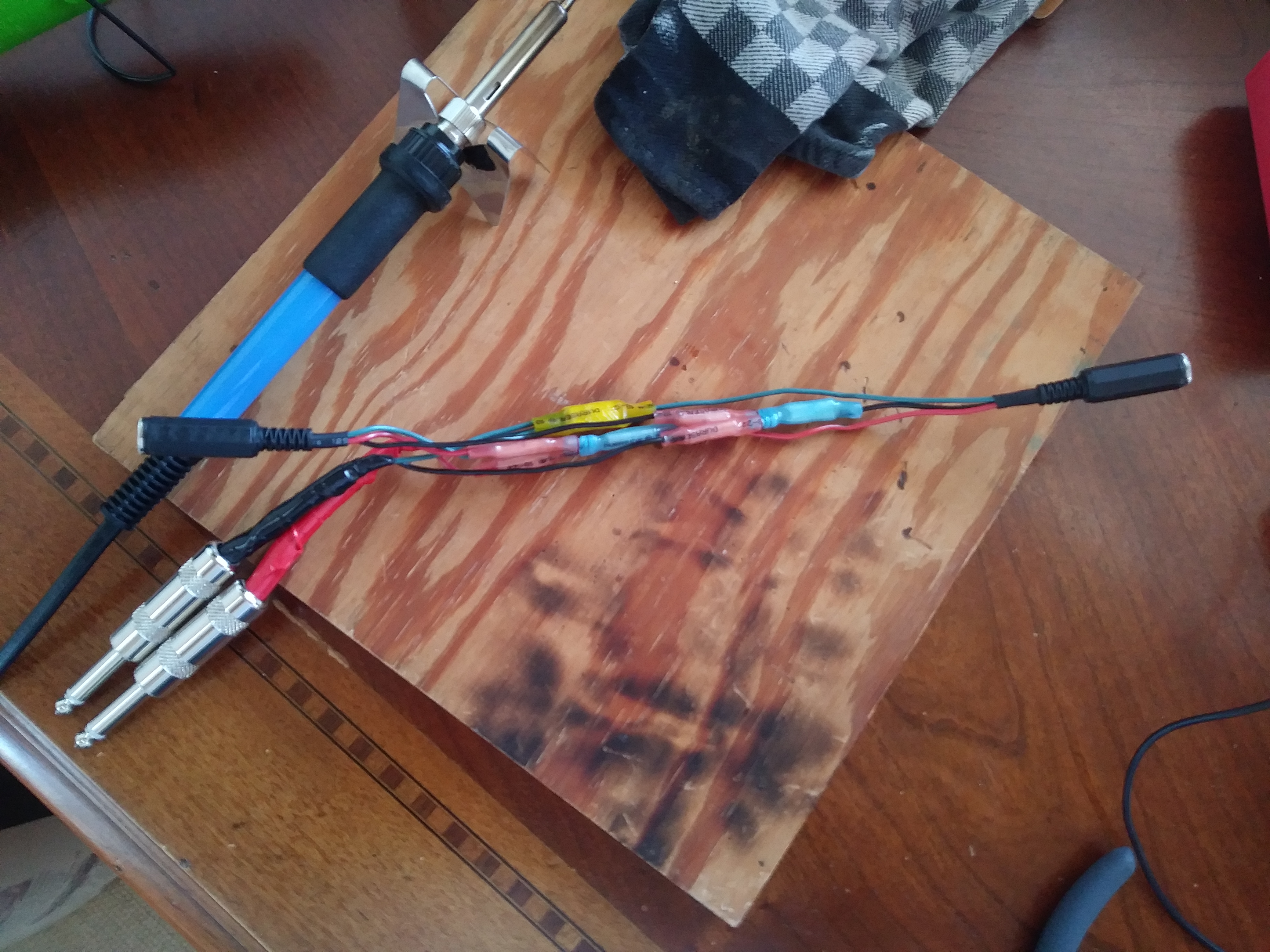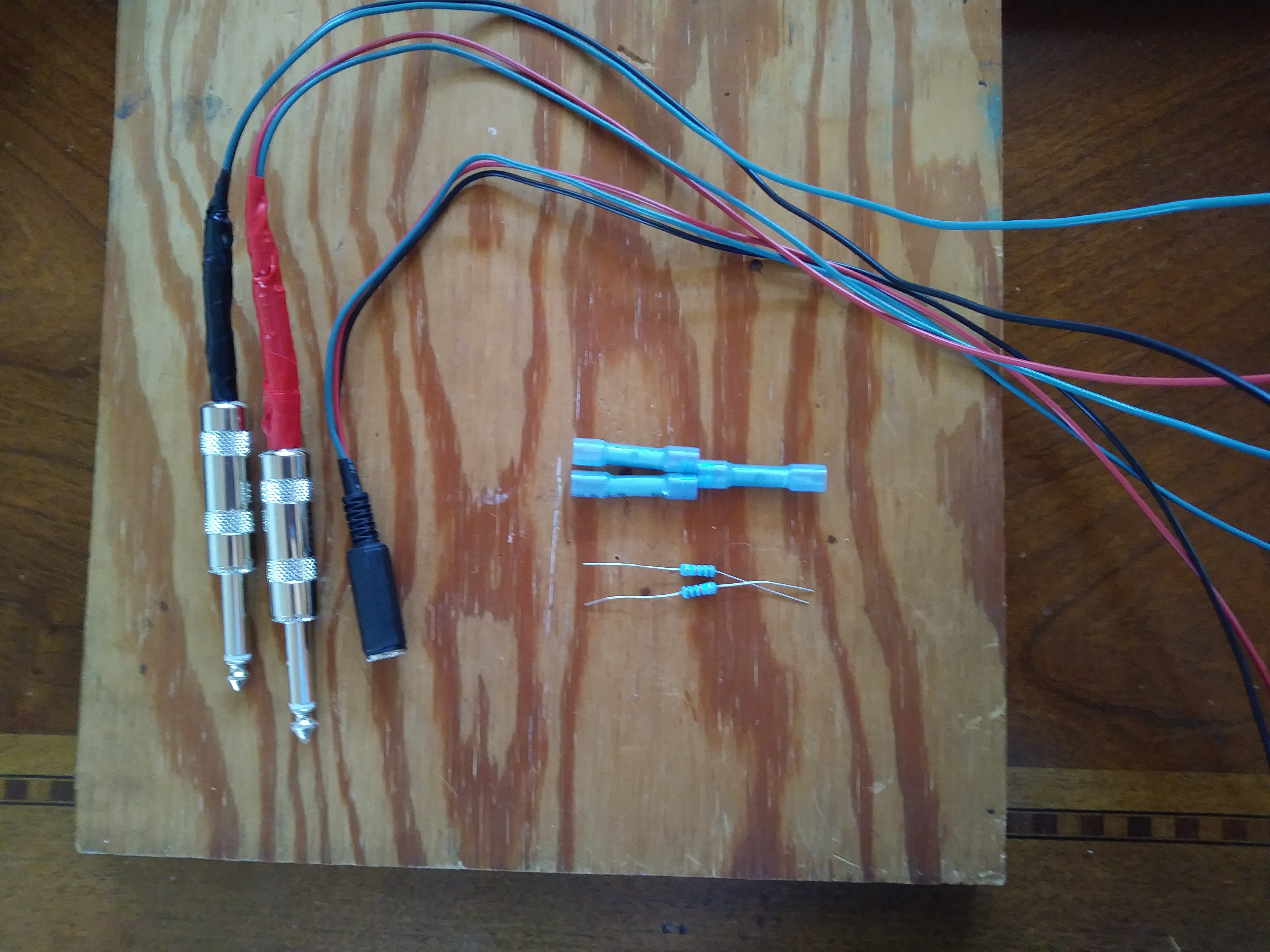 After finishing the summing cable, I realized I also wanted to be able to record the summed output. Not opening an already complex cable again, so made a 'Y' plug to split the output, and tried connecting my digital recorder off one branch with the other going to the amp. The signal was way too hot, so then I built a pad. Search for "reduce line to mic level" or similar if you want more background, the short story is that there is a 10kohm resistor on the line, then after that there's a 100ohm (0.1k) resistor connecting the line to ground. Yes, line to ground. The 100ohm resistor is in shunt, dumping signal. I wasn't sure that was going to work out, but it did. Here's the completed cable: