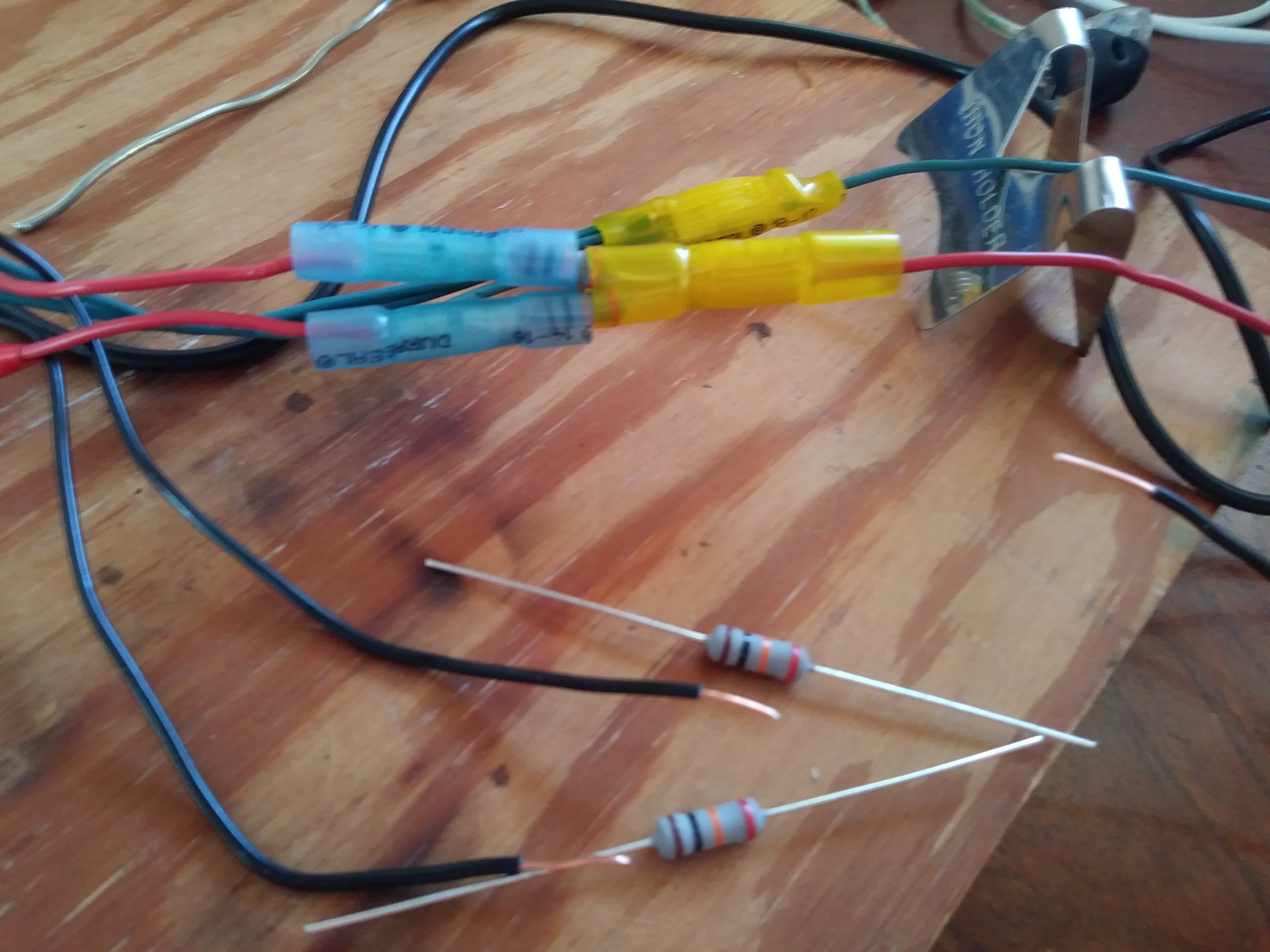 After getting the input connectors wired up and testing all the connections, I used heat-shrink butt splices to provide some structure for the resistors. Basically you crimp the splices on to make a connection, then use a heat gun to shrink the outside plastic down to provide some stress relief for the wire going in. Here's the concept, and the completed summing connections: