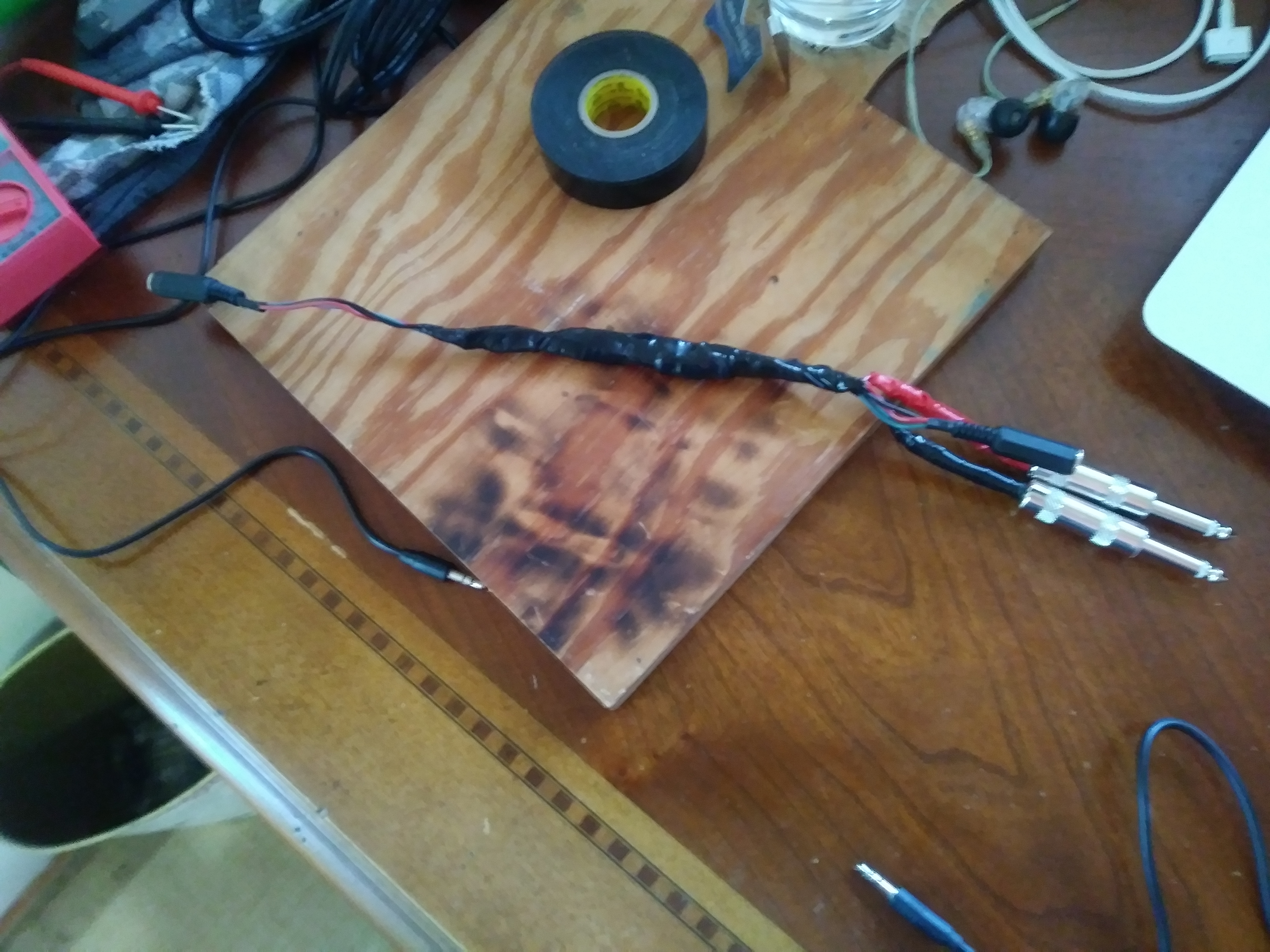 Unfortunately when I tried the rebuilt cable, the result was a distorted mess. Not like complete fuzzbox mess, but noticeable audio overdrive mess. I'm really not sure what went wrong, but connectivity testing showed it wasn't shorting. Possibly it was a bad patch cord, or something caught in a jack, but the upshot was I cut out all the resistors, re-tested all the connector wiring, and started to rebuild the cable yet again. But I only had the 1/2W resistors left. Found a stackexchange post saying that headphone output is typically 10-20mW. So it turns out that a 500mW resistor should actually be totally fine for these purposes. Here's the final summing cable before taping it up: