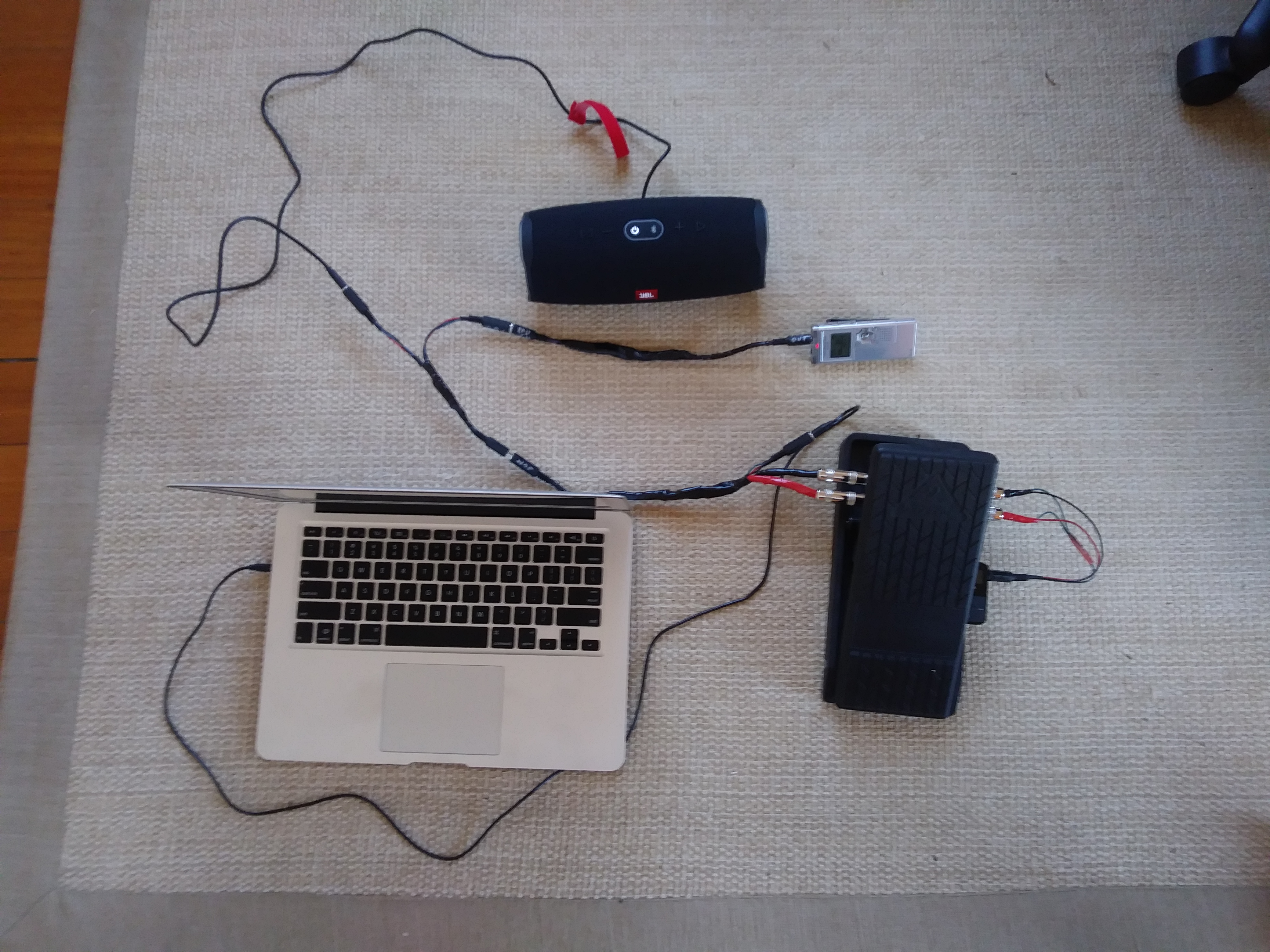 And here's an abbreviated rig showing how everything connects. You can see the SanDisk mp3 player attached to the right side of the Beringer volume pedal, and the output of the volume pedal going into the summing cable with the output from the laptop. The output from the summing cable goes into a 'Y' plug, and then from there to the amp and through the pad cable to the digital recorder.
