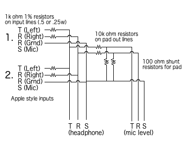 Here's the wiring diagram for the mixer. The summing portion is on the left, and the Y-plug/PAD part is on the right.